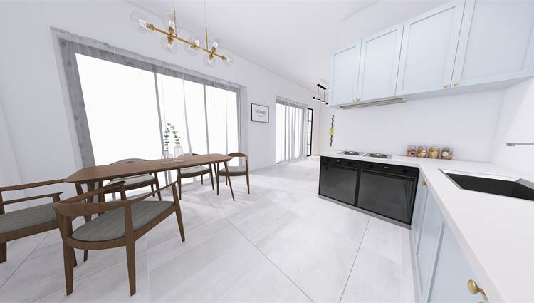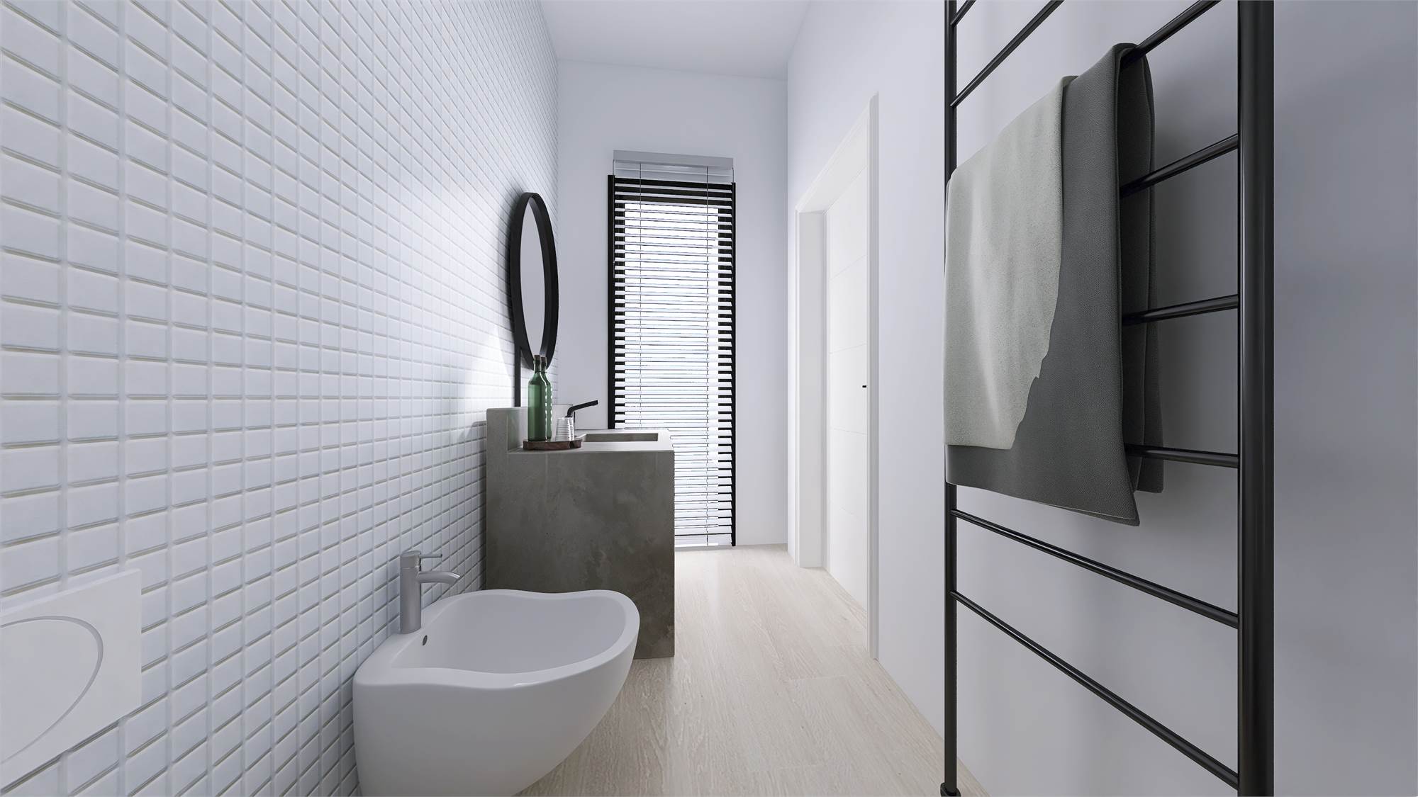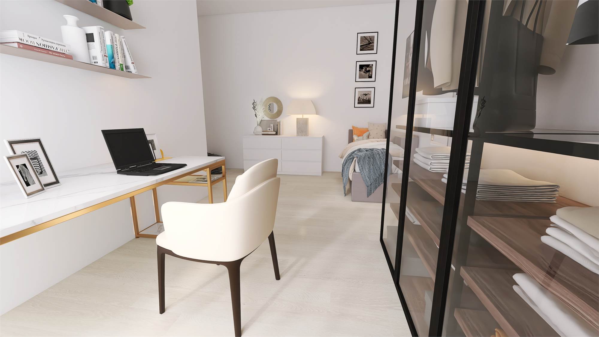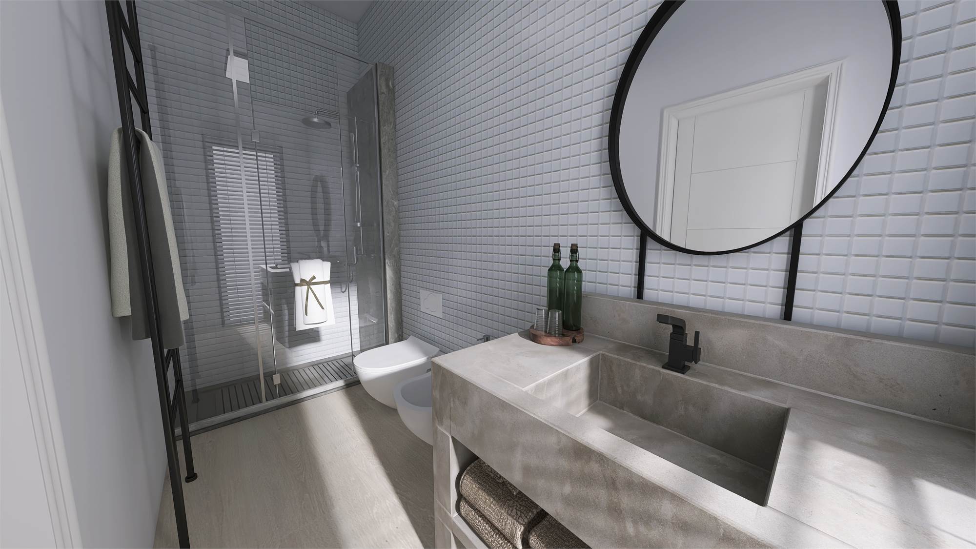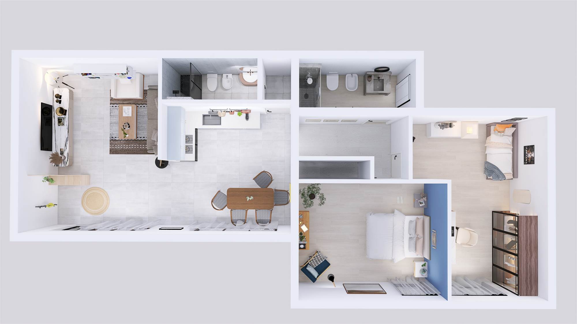 Il progetto contempla un ampio soggiorno con cucina a vista, un bagno con annesso antibagno di servizio per la zona giorno, un disimpegno notte che permette di ospitare un angolo lavanderia, due camere matrimoniali e un ulteriore bagno di servizio alla zona notte. A completare la proprietà, vi sono 2 autorimesse ai piani interrati.