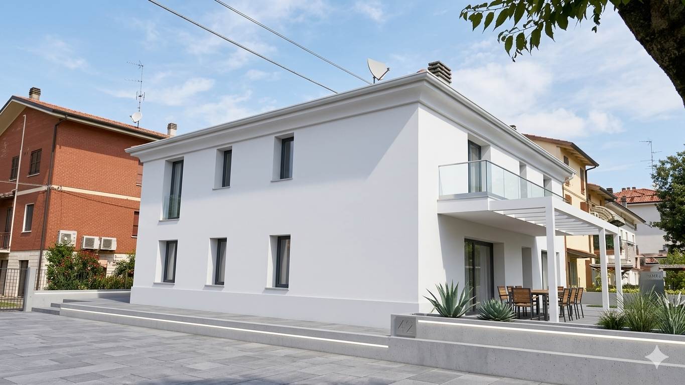 A piano primo, ampio alloggio con gran soggiorno con cucina a vista, balconata, disimpegno, 4 camere da letto, 2 bagni e ripostiglio/lavanderia.